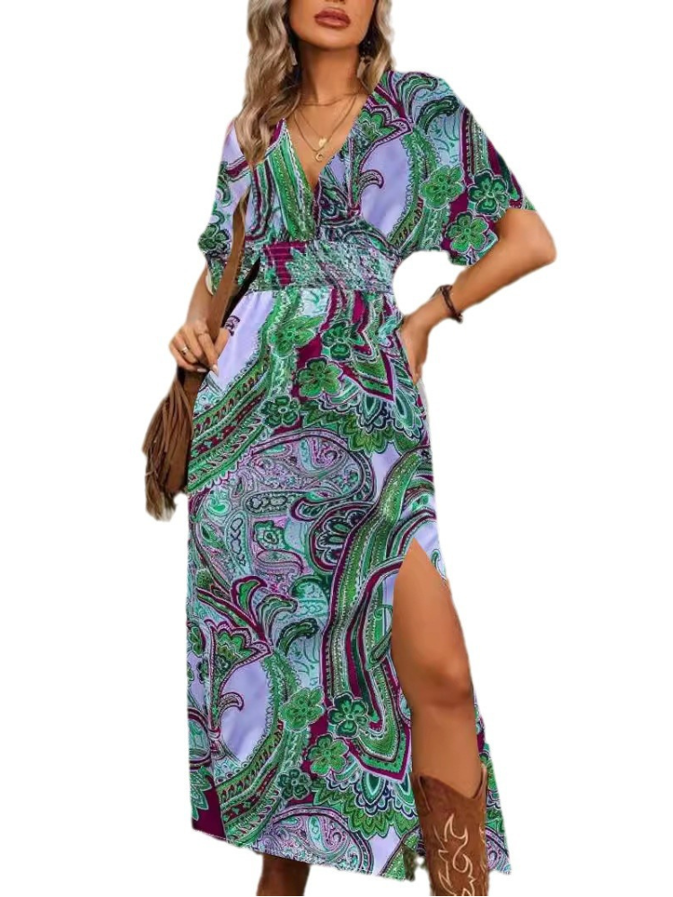With bohemian prints, a deep V-neckline, and three-quarter sleeves, this maxi dress delivers effortless charm. Whether you’re searching for an elegant maxi dress for women, a boho long sleeve dress, or a printed autumn slit dress, this piece is a versatile essential.