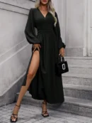 Make a statement with this Women’s Lantern Sleeve High Slit Dress. The combination of long lantern sleeves, a V-neckline, and high slit A-line skirt creates a perfect blend of elegance and glamour.